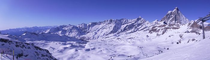 「アルプスでスキー」と言ったときに多くの日本人が思い浮かべるのが、フランスのChamonixか、ここZermattかのどちらかではないかと思います。中でもZermattは、ガソリン車乗り入れ禁止のポリシーと、マッターホルンの眺望とで知られています。私はイタリアのCerviniaから峠越えで行ったので、村の様子は見ていないのですが、どこから見てもマッターホルンが見えるというのは確かにその通りです。そしてその中でも最も標高の高いMatterhorn Glacier Paradise (昔はKlein Matterhornと呼んでいたはず)は、ゴンドラ山頂駅が標高3883m、そこからリフトに乗ると標高3899mまで到達することができます。そこからは気持ちの良い中斜面が延々と続き、どこまで滑れば終わるんだろうという感じで滑っていくと、やっと谷底に着くのがFurggというところで、この間標高差約1500mを一気に下ることになります。その先に広がるSchwarzseeエリアは、メインエリアから少し切り離された雰囲気の中、いろんなコースを選んで滑ることができてまた違った楽しみがあります。