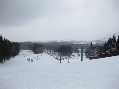 六呂師高原スキー場越前大野からちょっと行ったところにあるエリアが六呂師高原と呼ばれていて、ホテルを中心とした観光エリアになっているみたいなのですが、そのオマケのような感じで、リフト1本のスキー場が設置されています。ゲレンデは妙に横に広くて、どこを滑っていいか迷ってしまうぐらいなのですが、まあどこを滑っても同じです。そこから見えるのは、近隣の丘陵というか何というか、あまり特徴は無いものの、のどかで落ち着ける眺めです。福井から近いので、ちょっとしたピクニック気分で来るのには良いところなのでしょうね。まあスキーに燃えてる人は期待しないで下さい。