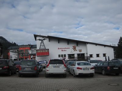 Kitzbühelが近づいてきたところで、T字路に差し掛かった。左に行くとKitzbühel、右に行くとKirchbergとある。KirchbergもKitzbühelスキー場の麓の町なので、どちらに行ってもいいのだが、やはり中心街に行った方が安心であろうと、左の道を進む。しかし後から思えばこれが最初の失敗であった。程なく到着したKitzbühelの町は、確かに賑わっていて人も車も多い。駐車場を探して右往左往の末、やっと見つけたところは有料駐車場で、一日7€も取られてしまった。それでもめげずに急いで準備をしてゴンドラ乗り場に向かうと、今度はリフト券売り場と乗車口の両方に長蛇の列。ちなみに今日は日曜日ではあるが、昨今の日本のスキー場に慣れた身には、こんなことは全くの想定外であった。こんなことなら町の中心街などに来ないで、もっとマイナーなところから入れば良かったのだ。ともあれ、目の前にはハーネンカムバーンと名づけられたロープウェイが見える(上の写真)。言わずとしれたハーネンカムコースへの登り口である。ここはじっと並んで順番を待ち、やっとロープウェイに乗れたのは11時頃であった。