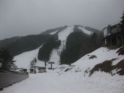 もう一度写真のリフトに乗って、今度はその左側のイエティコースを滑ってくる。ゲレンデマップでは中上級とあるが、穏やかなコースだ。しかしまた雨が降ってきた。下まで降りた時点で4時15分。あと1本滑っても良かったが、雨続きの一日でかなりめげてしまい、そのまま撤収することにした。