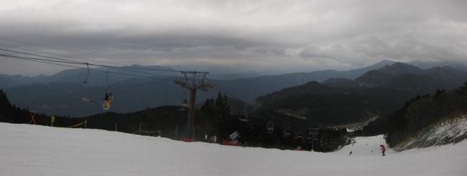 ちなみにここからちょっと歩くと、石鎚神社成就社という立派な神社があるらしい。石鎚山の頂上はそのずっと向こうで、標高にして570mの登りである。そちら側の景色も眺めてみたが、ちょっと雲が出ているようで、石鎚山のピークは良く見えない。とはいえ海側の景色が良く見えるだけでも良しとすべきであろう。さっそくコースを滑り始める。